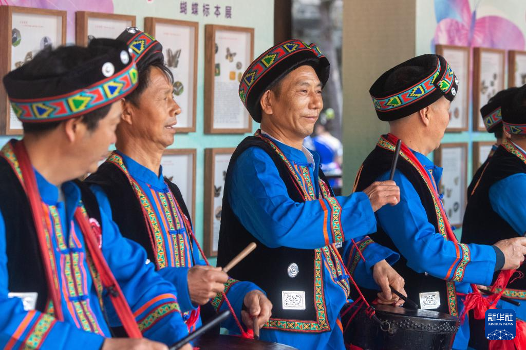 4月28日,苗族同胞在传统节日踩花山节上演奏乐器。