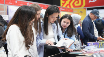 4月27日,在阿联酋阿布扎比国家展览中心,当地读者翻阅中国展台的图书。