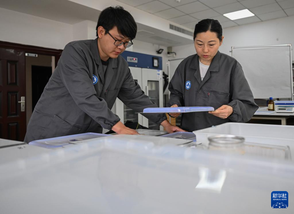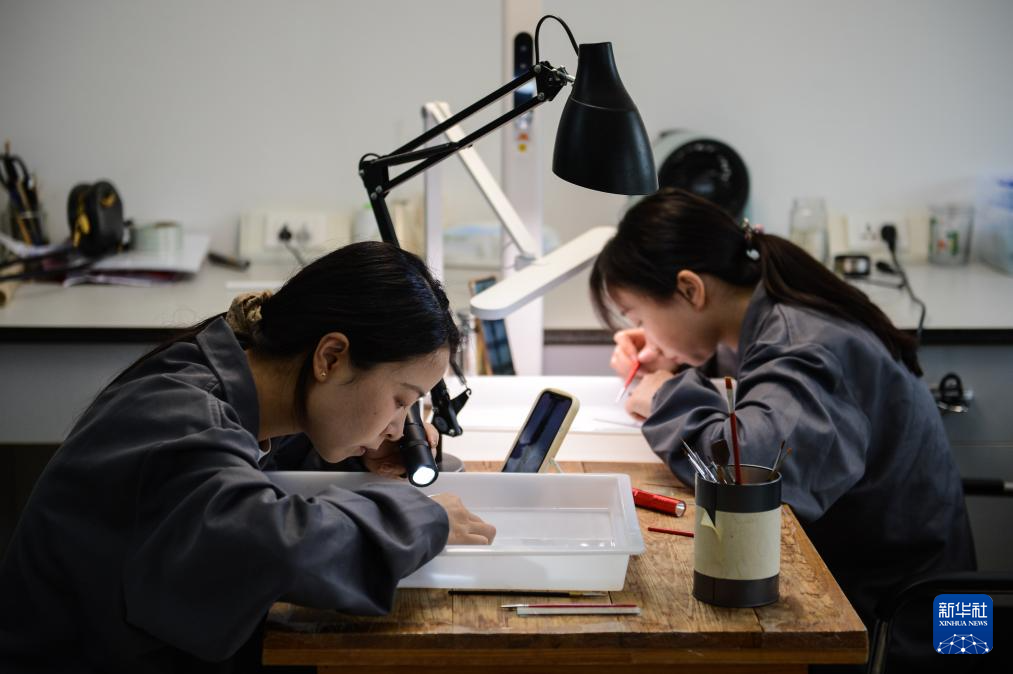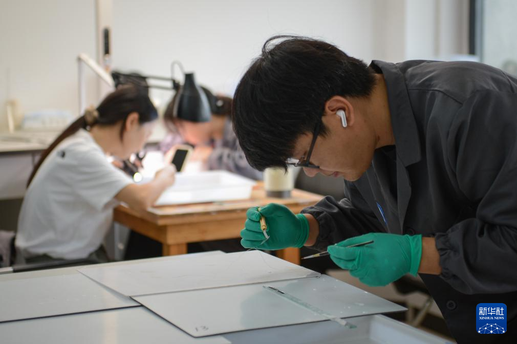 4月24日,在荆州文物保护中心简牍工作室,清华大学出土文献研究与保护中心副教授魏栋(右)查看牍片上的文字。