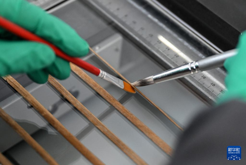4月24日,荆州文物保护中心简牍工作室工作人员把修复的竹简保存在箱中。
