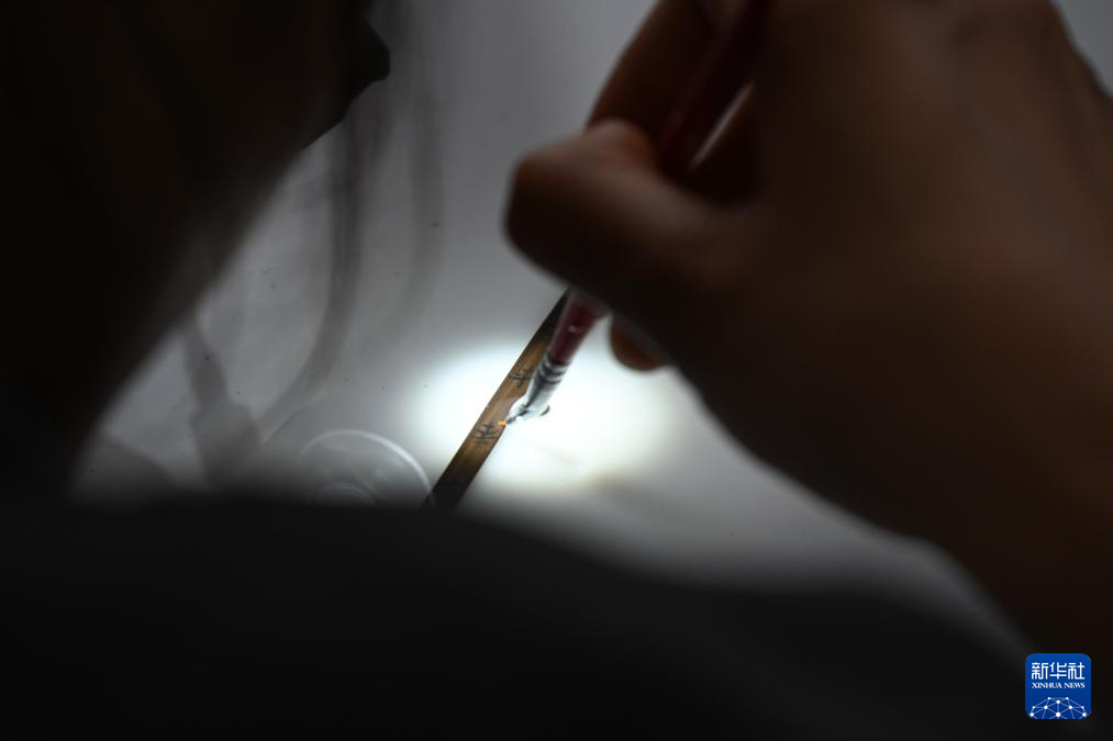 4月24日,荆州文物保护中心简牍工作室工作人员在处理竹简残片。