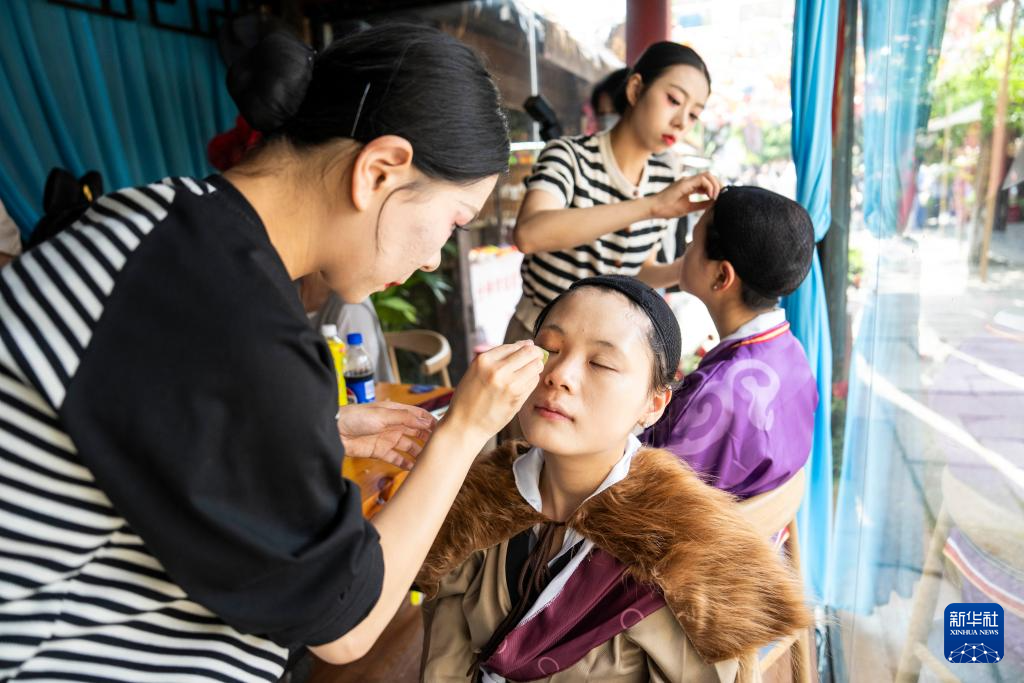 4月28日,在宁乡市炭河古城景区,学生(左二)在工作前化妆。