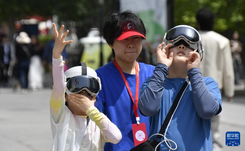 5月4日,游客在798艺术区内戴着VR眼镜游览。