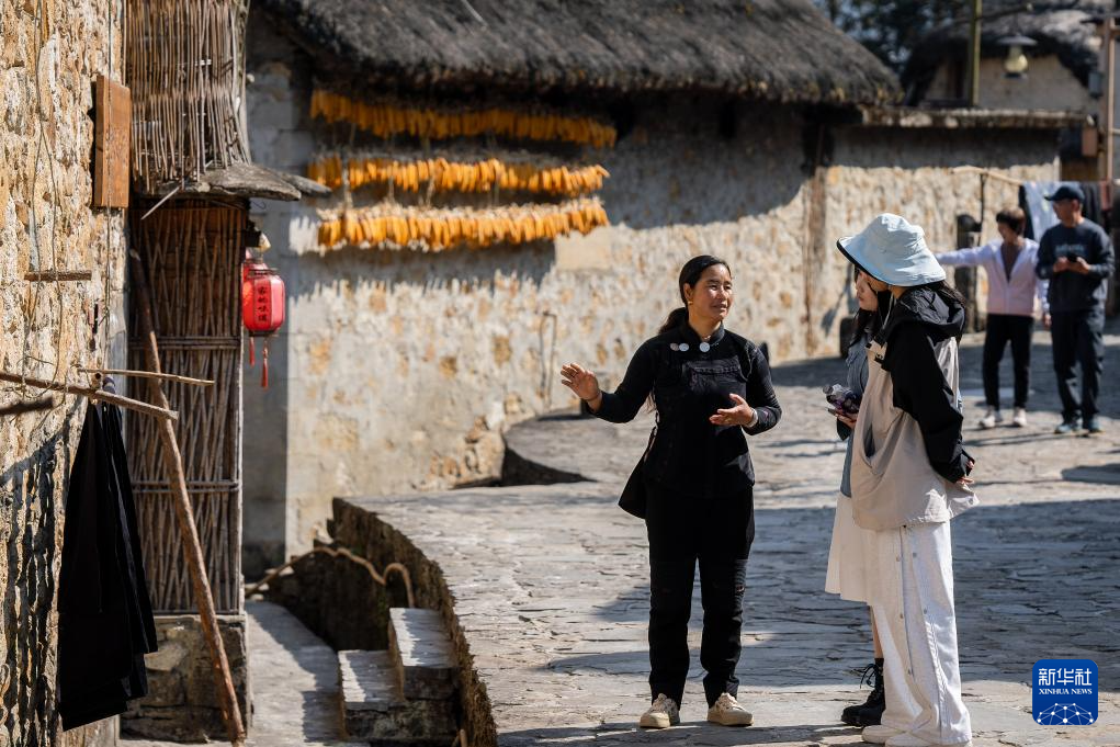 2月28日,在云南省元阳县阿者科村,村民导游高美华(左)在为游客讲解。