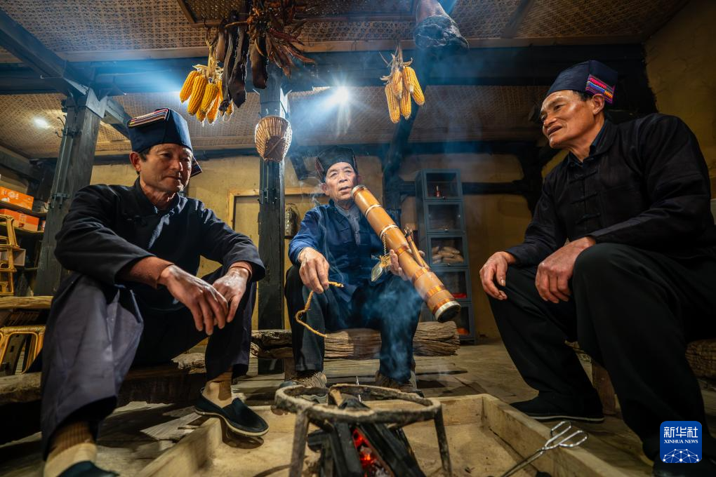 2月26日,在云南省元阳县阿者科村,国家级非物质文化遗产传承人马建昌(中)和徒弟一起演唱《哈尼古歌》。