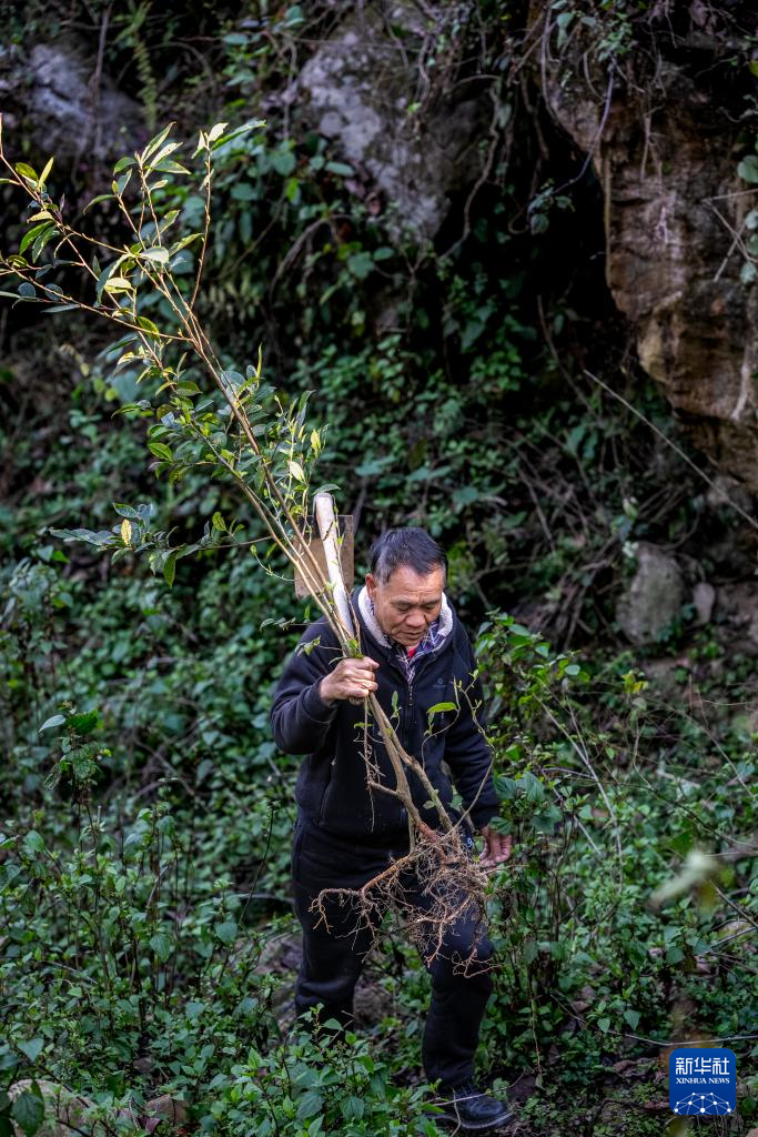 2月27日,在云南省元阳县阿者科村,护林员杨正有上山植树。