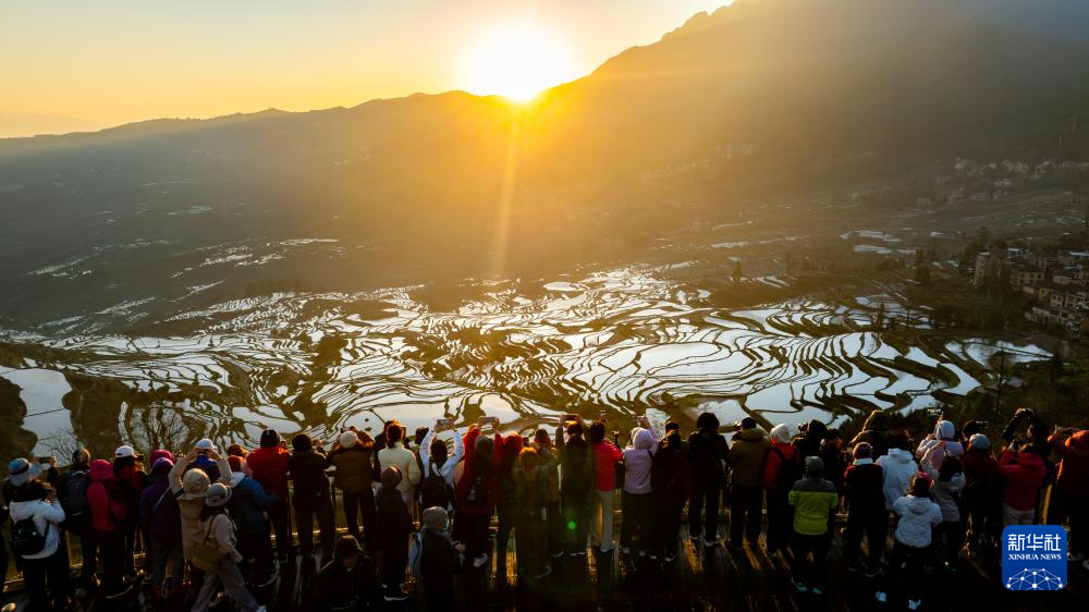 2月26日,游客在云南省元阳县阿者科村的梯田游览。