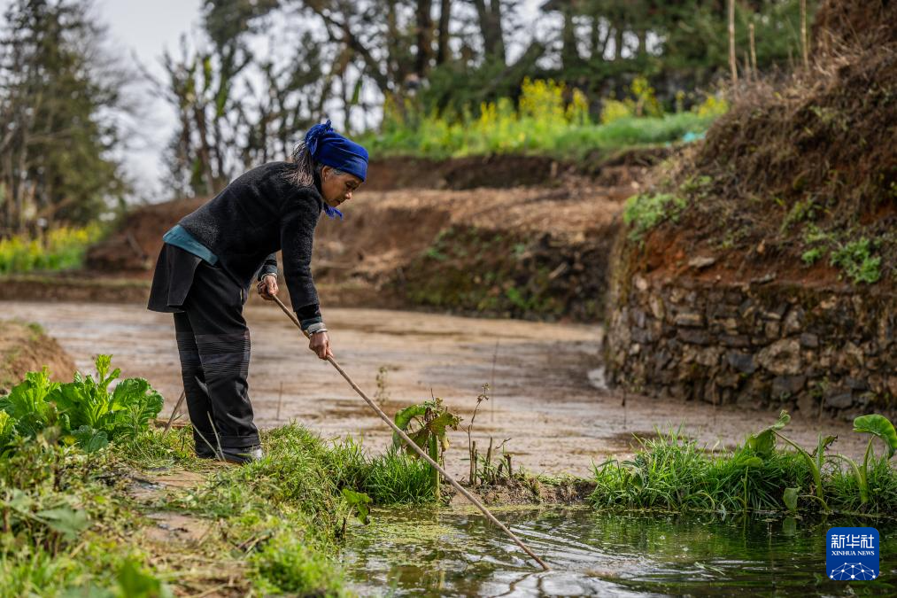 2月26日,在云南省元阳县阿者科村,“赶沟人”高有明在清理水渠中的树叶和垃圾,维系梯田的水源畅通。