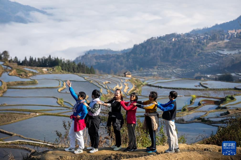 2月28日,在云南省元阳县阿者科村,游客在梯田拍照留影。