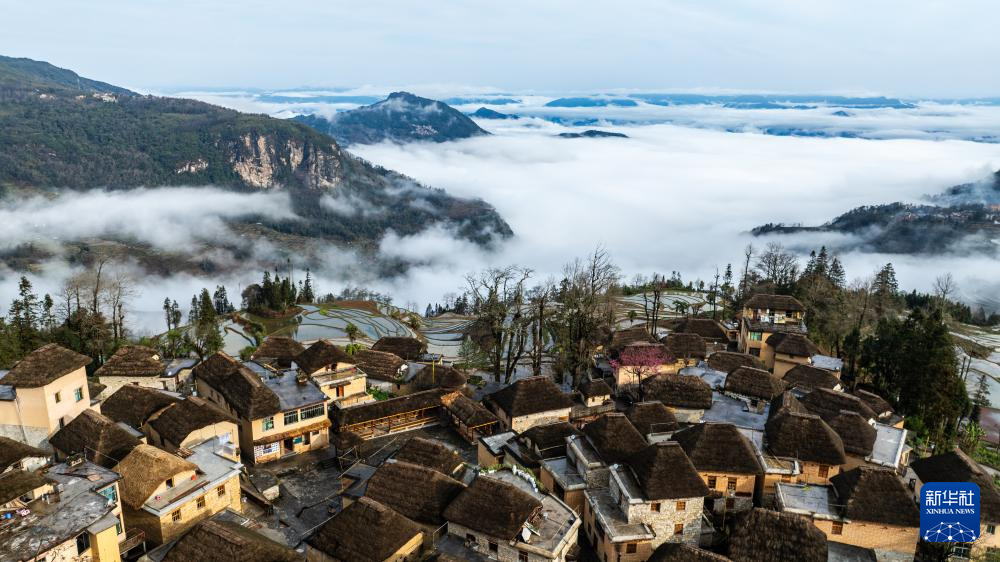 这是2月26日拍摄的云南省元阳县阿者科村的“蘑菇房”与云海、梯田(无人机照片)。