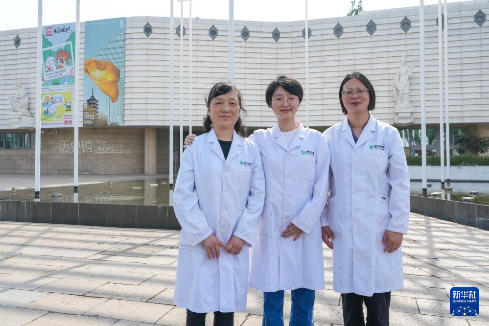 陈琰璐(中)和团队成员孟小紬(左)、张国华在苏州丝绸博物馆合影(5月19日摄)。