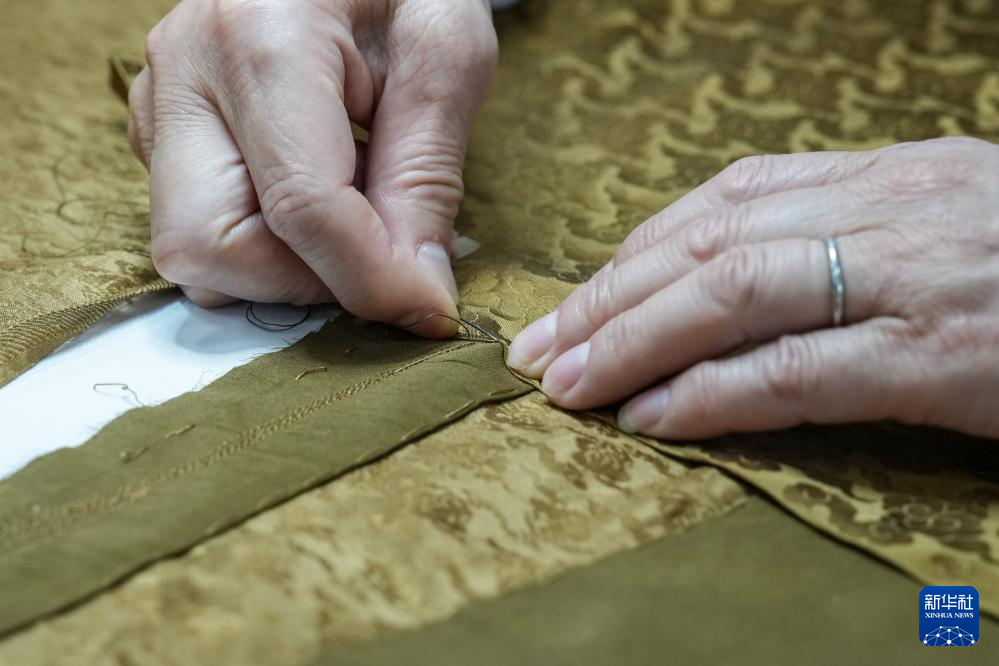 孟小紬在对织物进行针线修复(5月18日摄)。
