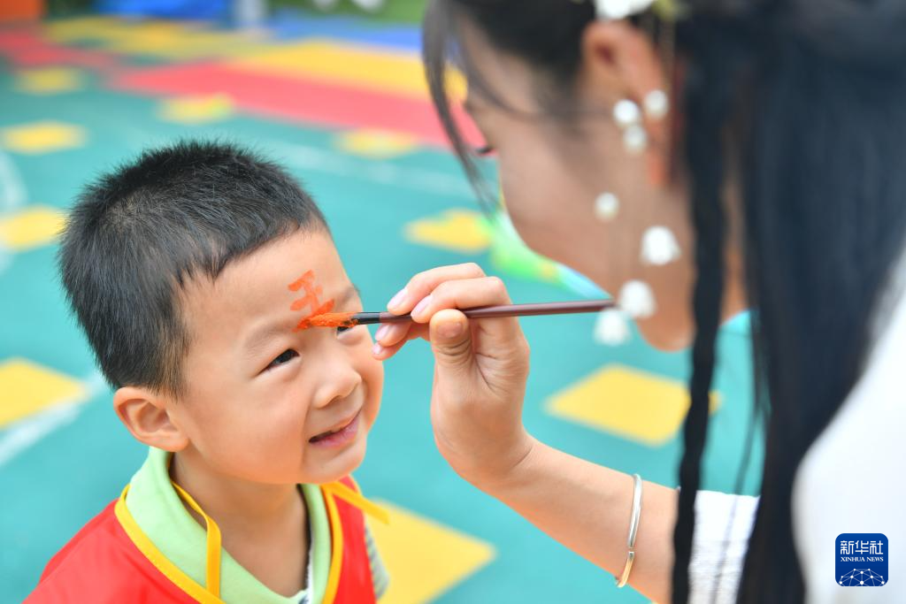 5月27日,在江西省吉安市吉州区馨悦幼儿园,老师蘸取雄黄为孩子额头点上“王”字。