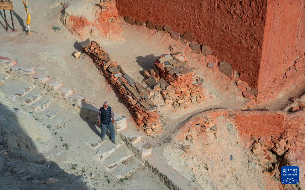 仁增旺扎在检查石窟外立面的风化情况(6月24日摄)。