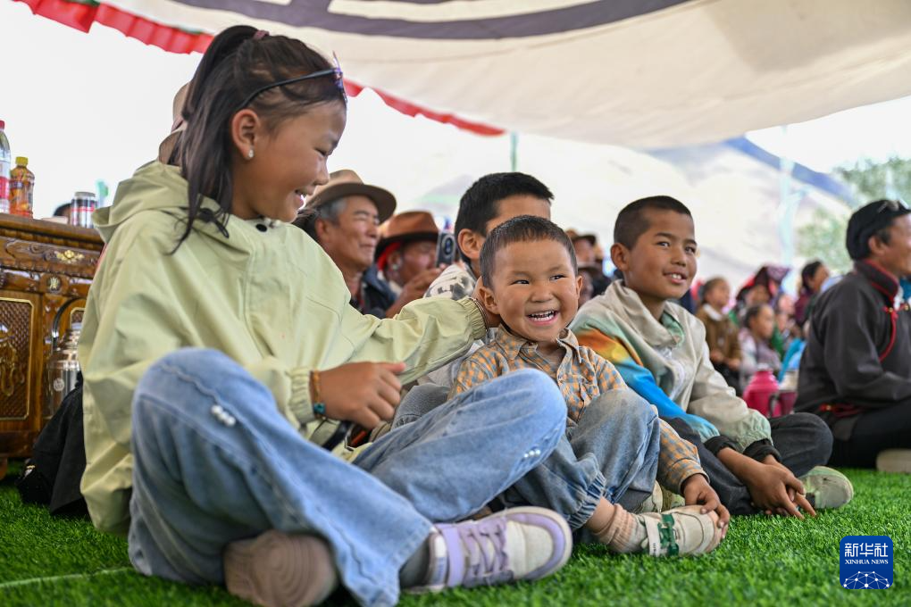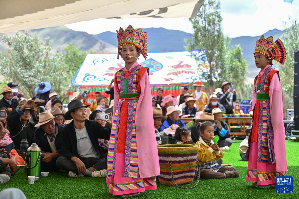 7月16日,76岁的湘巴藏戏国家级非遗传承人次仁多吉(右二)在南木林县非遗公园内给即将表演湘巴藏戏的小演员整理服装。
