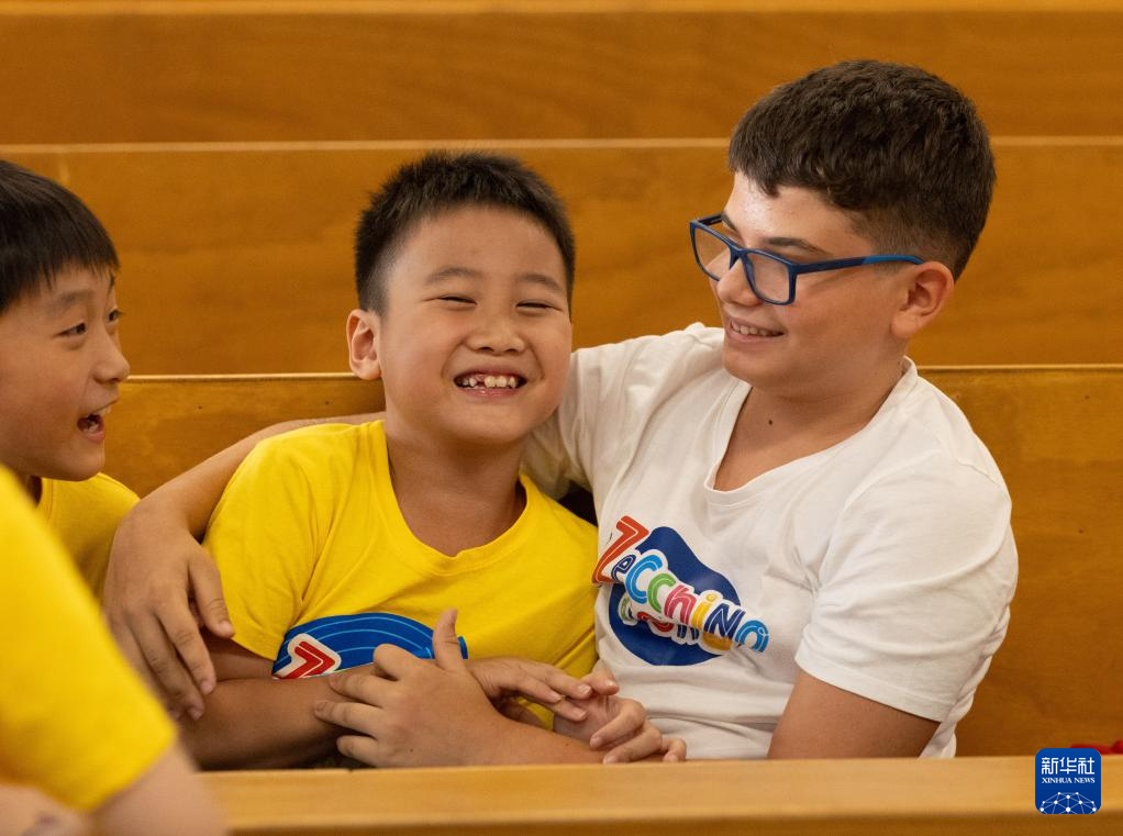 7月18日,在意大利博洛尼亚,绣球花小合唱团团员陆宸(中)与安东尼亚诺小合唱团团员埃利亚·鲁比尼在一起玩耍。