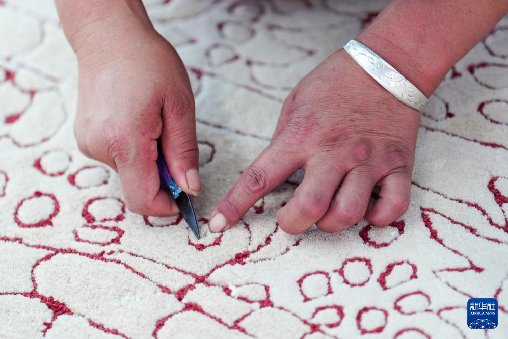 7月21日,一名操作工在西宁市圣源地毯集团有限公司生产车间制作藏毯。