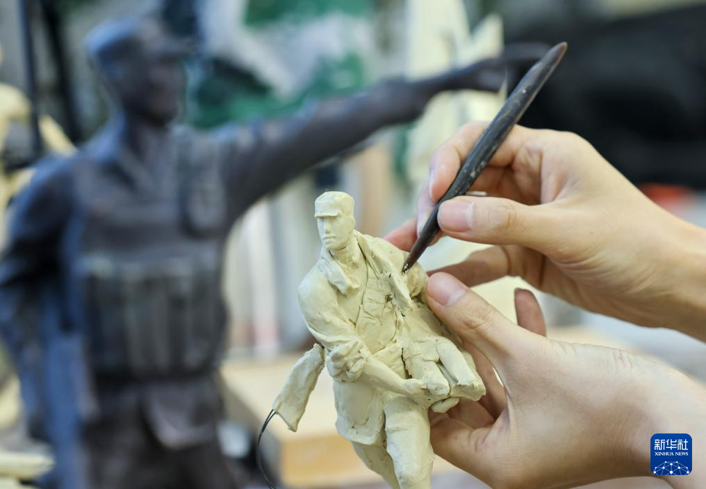 7月17日,中国人民革命军事博物馆创作员谈强在进行雕塑创作。