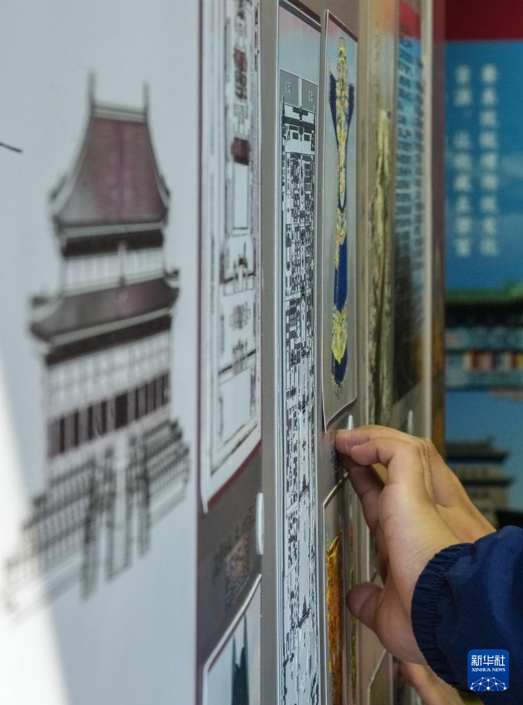 10月13日,视障人士在工作人员帮助下,触摸北京中轴线建筑模型。