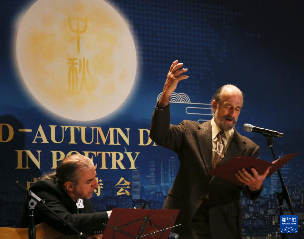 10月13日,在位于纽约的联合国总部,纽约诗人柯克·拉森在2025“天涯共此时——中秋诗会”上朗诵他专门为中秋创作的英文现代诗《又到丰收佳节》。