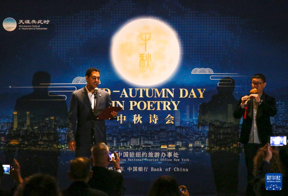 10月13日,在位于纽约的联合国总部,美国纽约市议员克里斯托弗·马特在2025“天涯共此时——中秋诗会”上用中英双语朗诵《静夜思》。