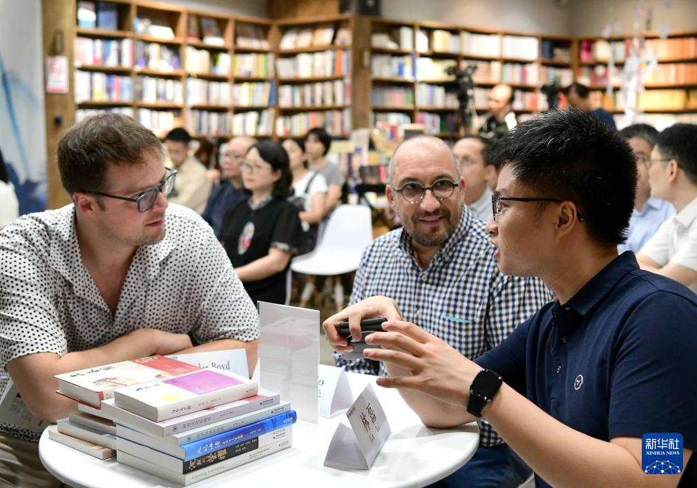 10月19日,美国《中国书评》副主编李乐(前左)和西班牙瓦伦西亚大学东亚研究所教授加布里埃尔·罗乔(前中)同工作人员交流。