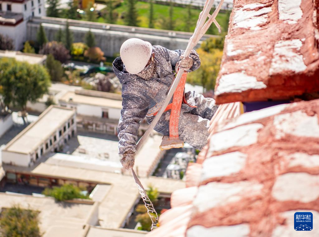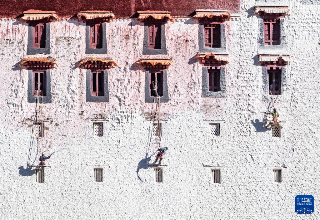 近日,西藏布达拉宫迎来一年一度的粉刷“美容”。工作人员和志愿者将粉刷材料按比例混合,经过滤后对布达拉宫墙体进行喷涂,让建筑更加美观。
