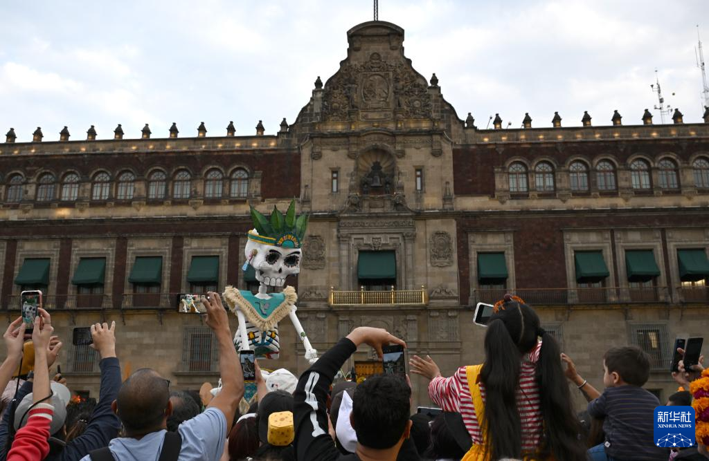 11月1日,在墨西哥首都墨西哥城,民众观看亡灵节游行并自拍留影。