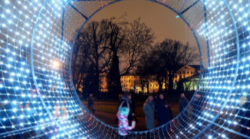 11月17日,民众在拉脱维亚首都里加举行的灯光节上欣赏滨海公园的灯光艺术装置。