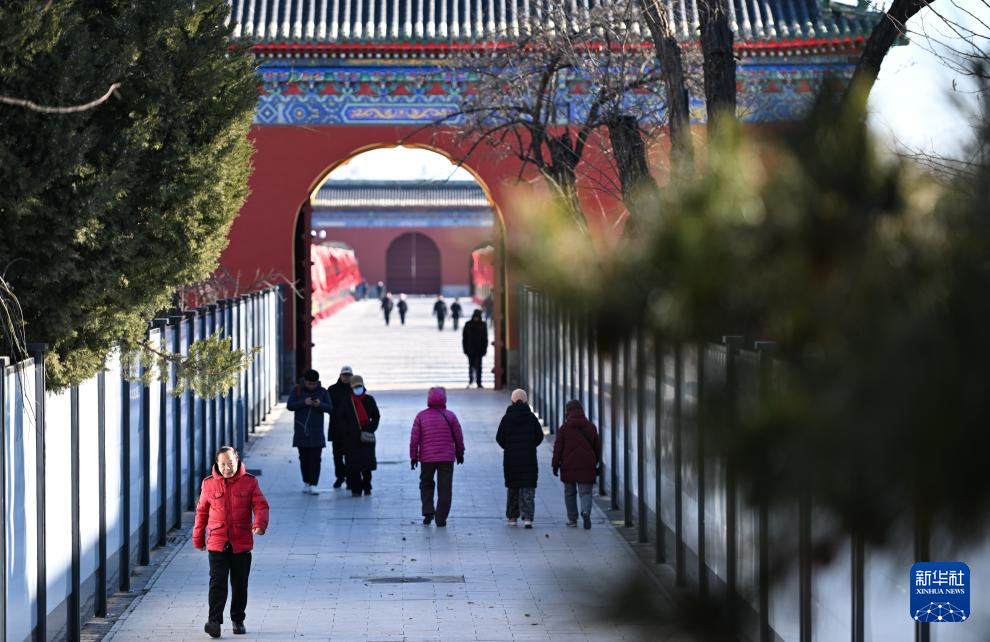 12月30日,游客行走在连接先农坛内外坛的一段道路上。