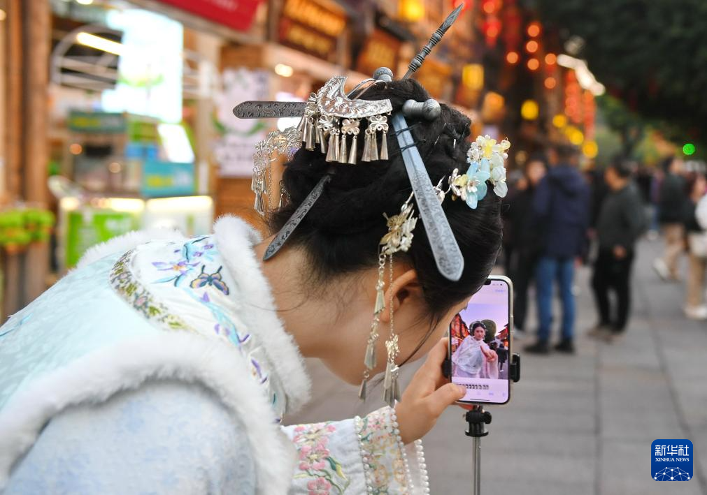 1月9日,游客头戴“三条簪”在福州三坊七巷南后街爱心树前打卡拍照。福州“三条簪非遗IP”入选全国“非遗融入现代生活”典型创新实践名单。