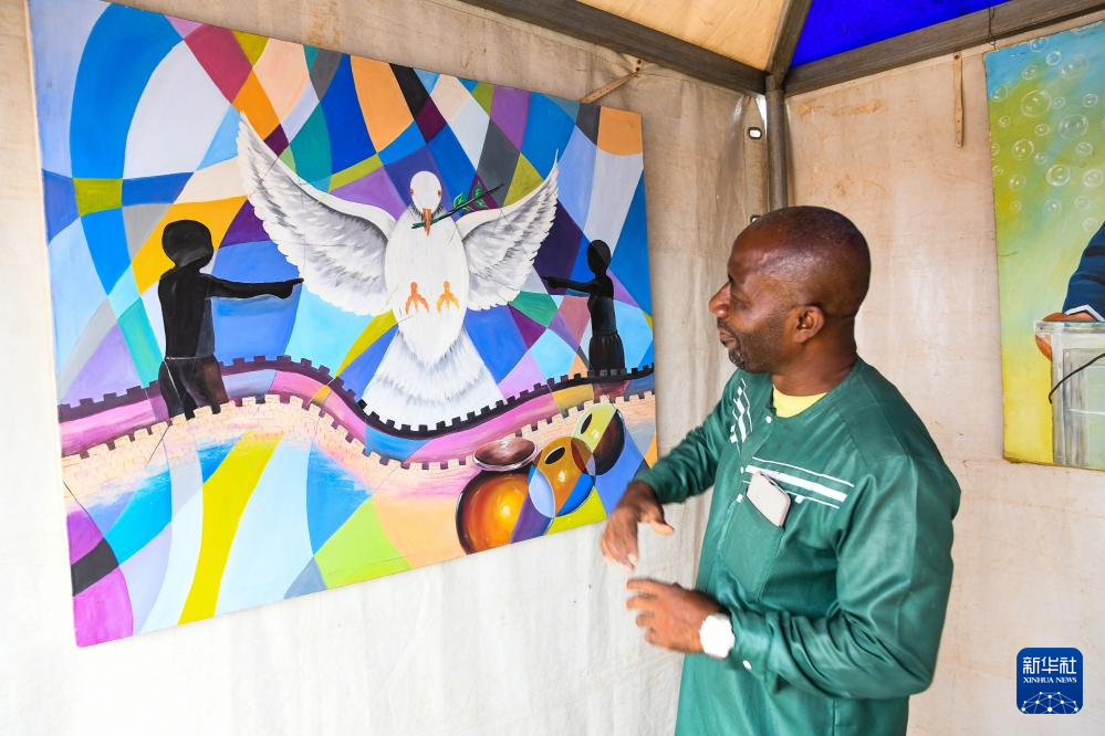 1月24日,在喀麦隆首都雅温得举行的世界非洲和非洲裔文化日庆祝活动上,一名艺术家展示绘画作品。