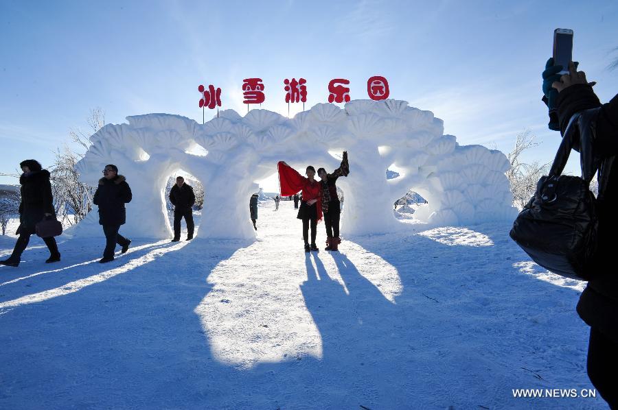 Tourists pose for photos at Mangui Township in Hulunbuir, north China's Inner Mongolia Autonomous Region, Dec. 22, 2017. The 2017 Greater Khingan Ice and Snow Festival closed here on Friday. (Xinhua/Li Renzi)