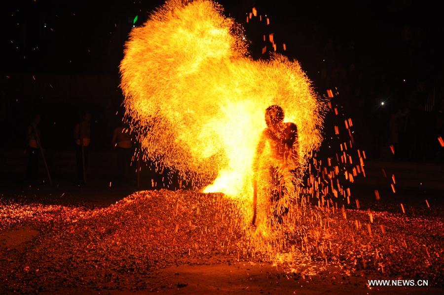 A villager walks through sparkles when stepping on the charcoals in Shuangfeng Township of Pan'an County, east China's Zhejiang Province, Dec. 22, 2017. The performance was a traditional folk custom with a long history in Pan'an. (Xinhua/Kong Debin)