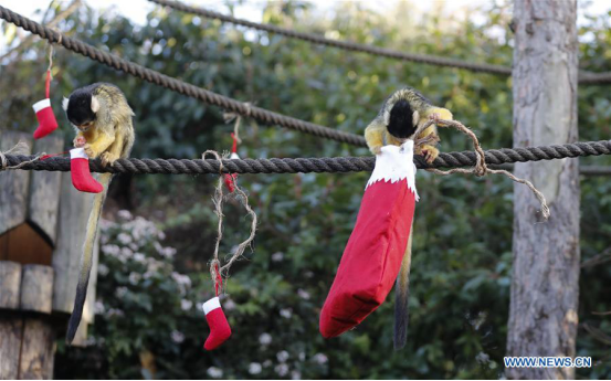 Squirrel monkeys look for their presents during a photocall of animals enjoying festive treats at Zoological Society of London in London, Britain on Dec. 14, 2017. (Xinhua/Han Yan)