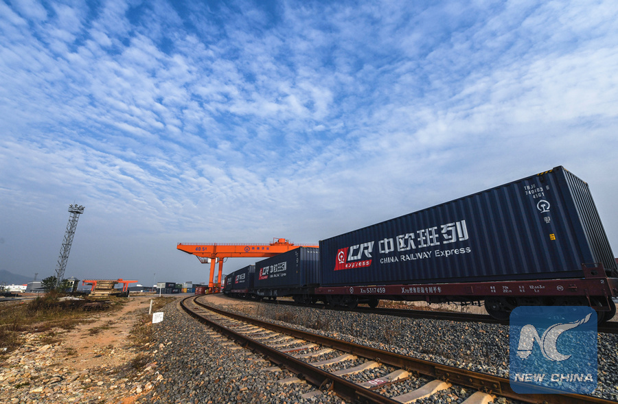 A China-Europe freight train laden with goods departs from Yiwu west station in Yiwu, east China's Zhejiang Province, Nov. 8, 2017. (Xinhua/Xu Yu)
