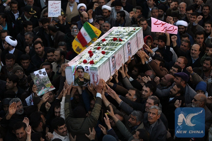Iranian pro-government supporters march during the funeral of a young member of the Revolutionary Guards, Sajjad Shahsanai, in the city of Najafabad, west of Isfahan, on January 3, 2018. (AFP Photo)