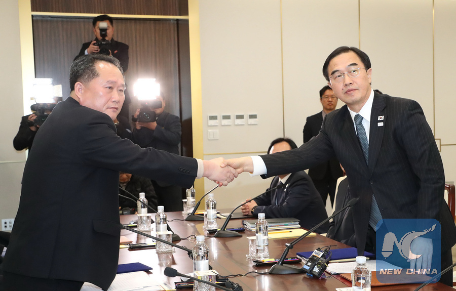 Ri Son-gwon (L), chairman of the Committee for the Peaceful Reunification of the Fatherland of the Democratic People's Republic of Korea (DPRK), shakes hands with South Korean Unification Minister Cho Myoung-gyon at Peace House, a South Korean building in the truce village of Panmunjom, Jan. 9, 2018. (Xinhua/Newsis)