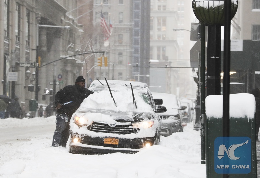 A man clears snow on his vehicle in New York, the United States, on Jan. 4, 2018. (Xinhua/Wang Ying)