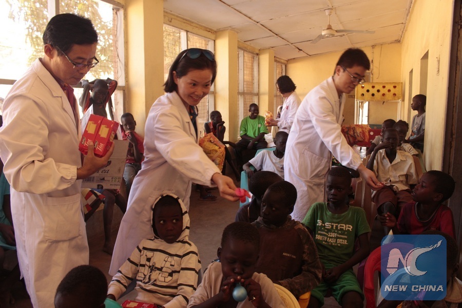 Chinese doctors in South Sudan distribute Christmas gifts to Juba Orphanage Home in Juba, capital of South Sudan, Dec. 20, 2017. Chinese medical team in South Sudan on Wednesday donated stationery, shoes, balloons, balls and sweets to 52 orphans living at the government-aided facility. (Xinhua/Gale Julius)