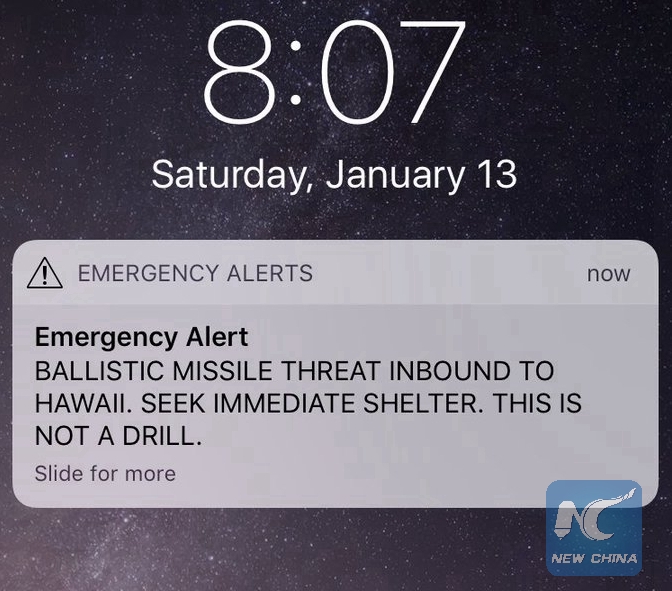 LOS ANGELES, Jan. 13 (Xinhua) -- Hawaiians on Saturday received cell phone emergency message warning of a "ballistic missile threat inbound to Hawaii," but officials from the U.S. state quickly dismissed as "false."