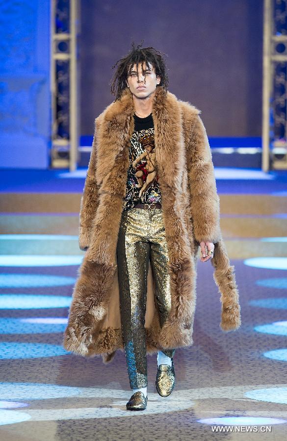 A model presents creations for fashion house Dolce&Gabbana during Milan Men's Fashion Week Fall/Winter 2018/19 in Milan, Italy, Jan. 13, 2018.(Xinhua/Jin Yu)