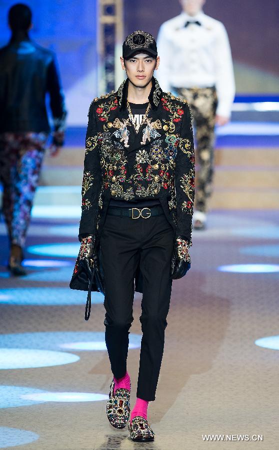 A model presents creations for fashion house Dolce&Gabbana during Milan Men's Fashion Week Fall/Winter 2018/19 in Milan, Italy, Jan. 13, 2018.(Xinhua/Jin Yu)
