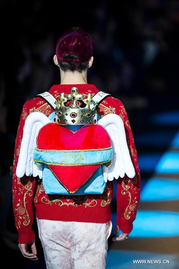 A model presents creations for fashion house Dolce&Gabbana during Milan Men's Fashion Week Fall/Winter 2018/19 in Milan, Italy, Jan. 13, 2018.(Xinhua/Jin Yu)