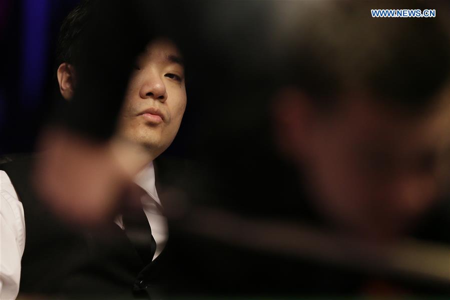 Ding Junhui of China looks across the table during the first round match with Ryan Day of Wales at Snooker Masters 2018 at the Alexandra Palace in London, Britain on Jan. 15, 2018. Ryan Day won 6-4. (Xinhua/Tim Ireland)