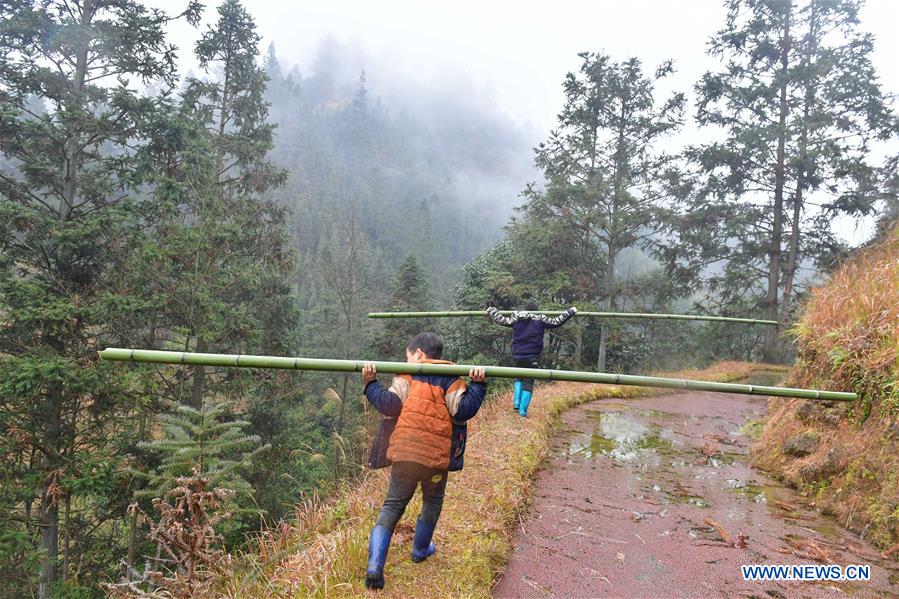 The 11-year-old Pan Zhiyong (L) carries bamboos on his shoulders in Wuying Village of Miao ethnic group in Rongshui County, south China's Guangxi Zhuang Autonomous Region, Jan. 14, 2018. Local people were busy making lusheng to greet the New Year festival of Miao ethnic group. (Xinhua/Huang Xiaobang)