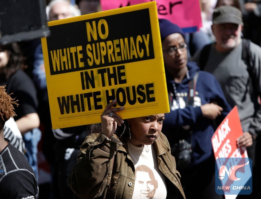 File photo taken on April 15, 2017 shows people as they carry signs and march at a Black Lives Matter protest in Seattle, Washington. (Xinhua/AFP)