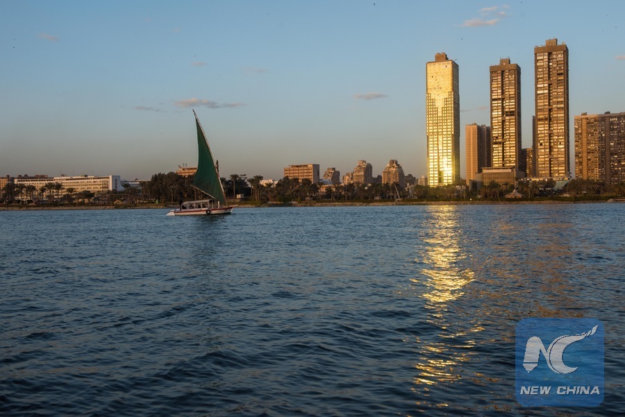 A sailing boat is seen amid sunset glow on the Nile River near Cairo, Egypt, Jan. 26, 2017. (Xinhua/Meng Tao)