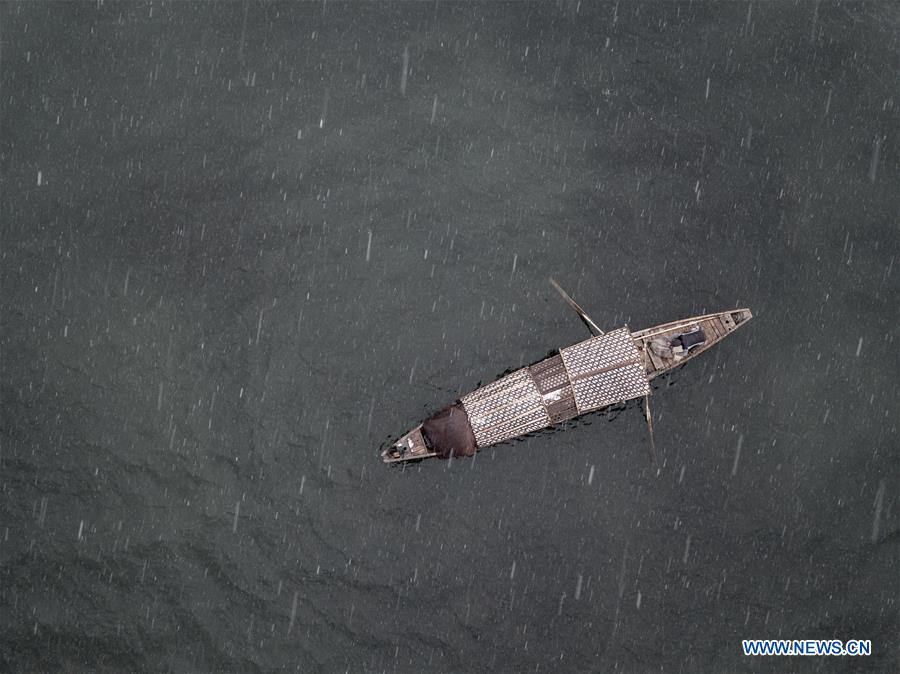 A fishing boat sails as snow falls in Sanjiangkou village, Sandu township, Jiande city of east China's Zhejiang Province, Jan. 31, 2018. (Xinhua/Shen Hong)