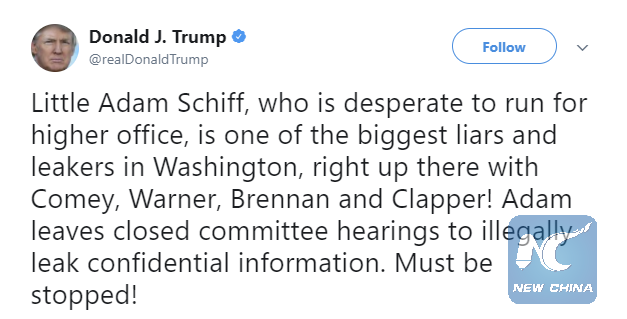 WASHINGTON, Feb. 5 (Xinhua) -- U.S. lawmaker Adam Schiff on Monday exchanged fire with President Donald Trump who slammed him over his efforts to release another edition of the disputed memo alleging the FBI and Justice Department of surveillance abuses in the Russia probe.